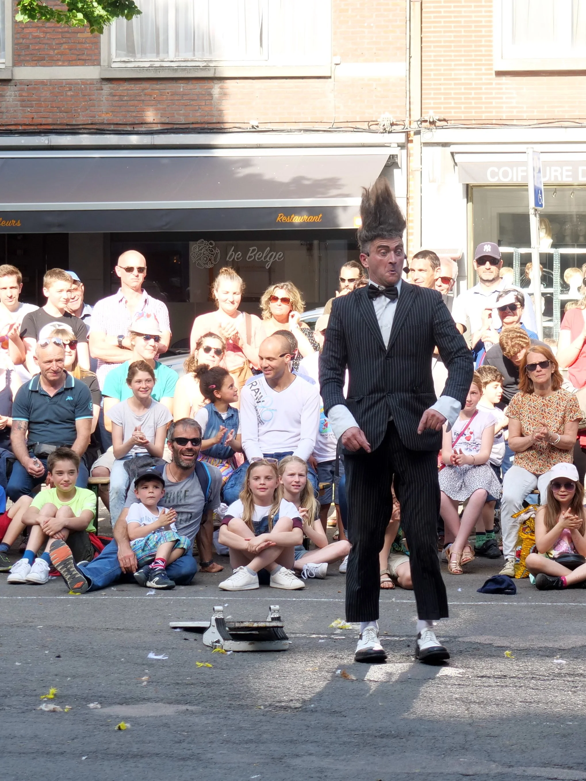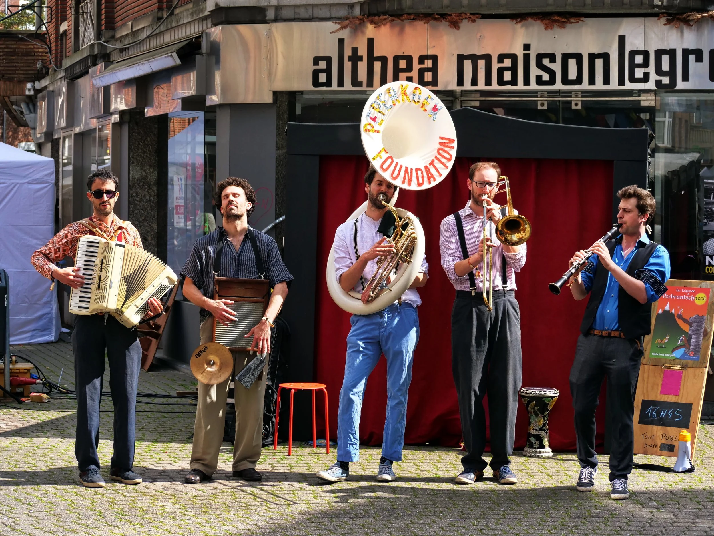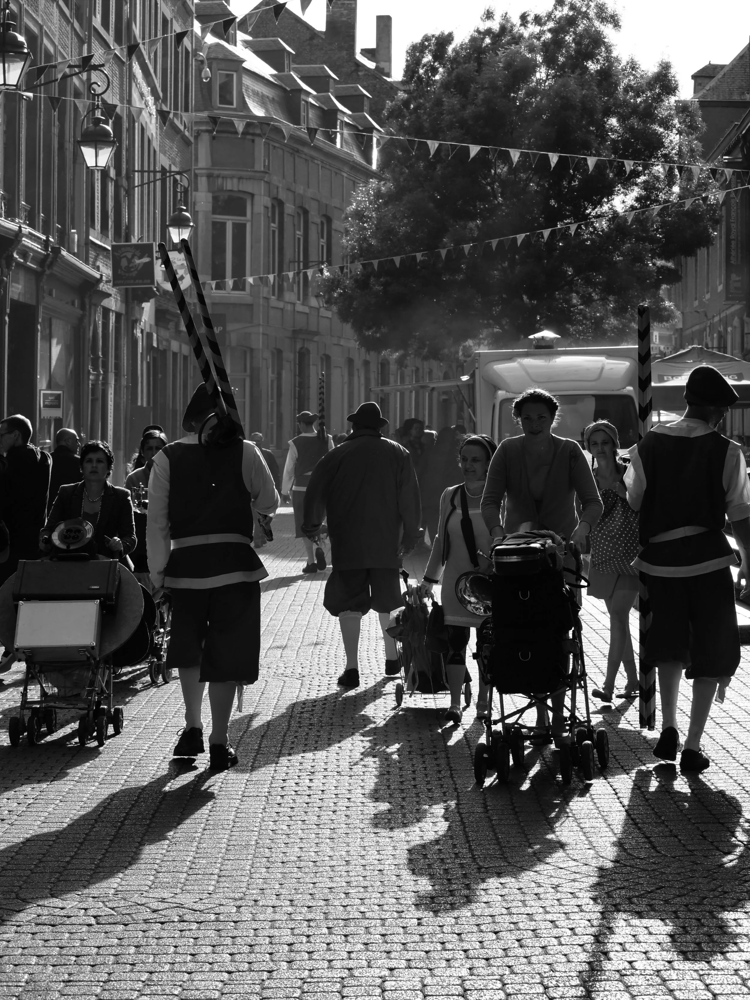 The Echasseurs Namurois heading towards their next joust, while a music band makes its way in.